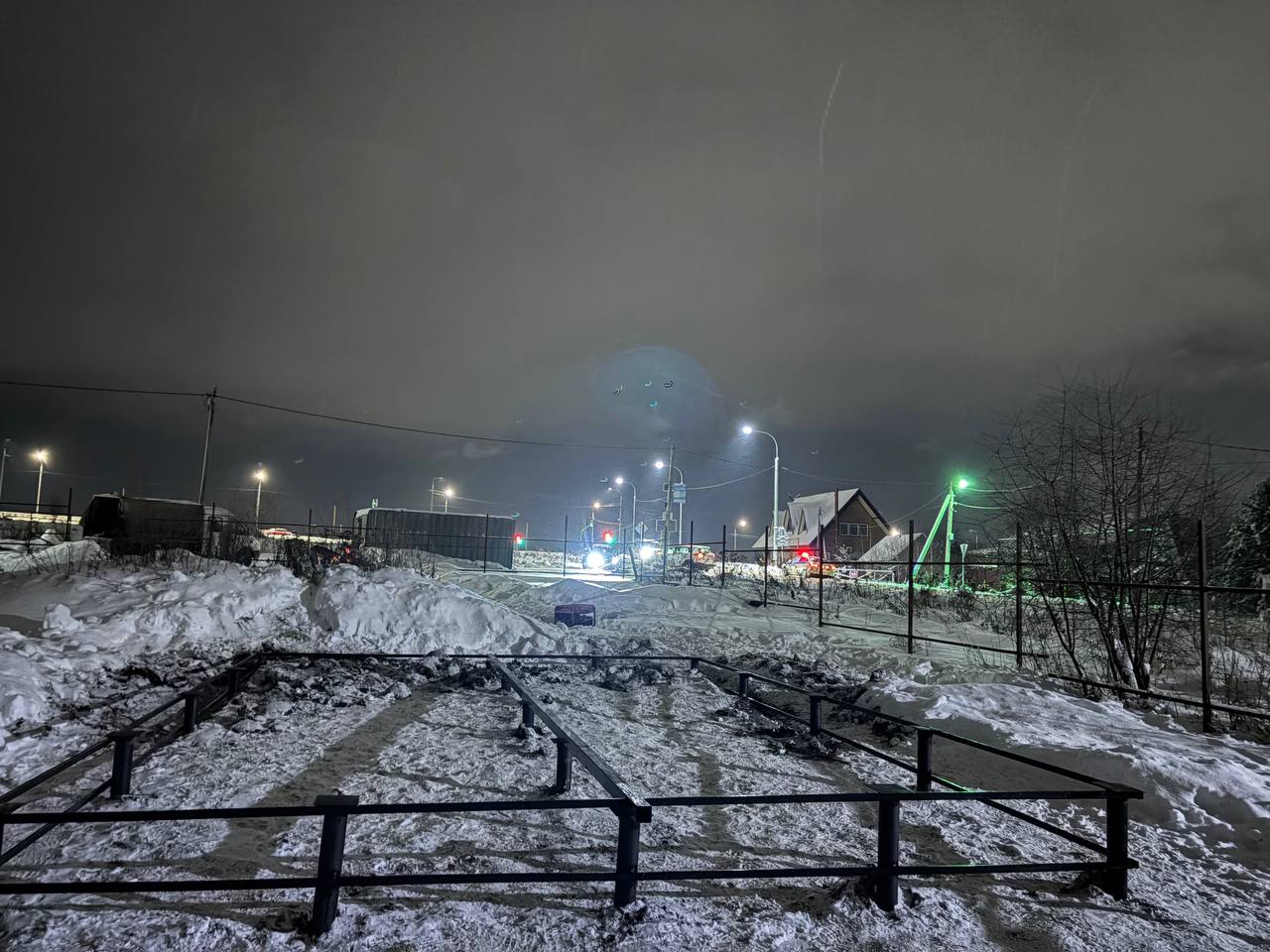 Процесс погружения винтовых свай проходил под строгим контролем уровня. Каждая свая завинчивалась на глубину ниже уровня промерзания почвы, что гарантирует стабильность фундамента в любое время года. После того как все опоры были установлены, мы произвели их обрезку по единому горизонтальному уровню и заполнили полости цементно песчаной смесью для предотвращения коррозии изнутри. Завершающим этапом монтажа стала приварка оголовков. Несмотря на то что рабочий день затянулся и финальные кадры были сделаны уже в сумерках, на качестве работы это никак не отразилось. На вечерних фото можно заметить легкую дымку и недостаток освещения, но даже в таких условиях видна четкая геометрия и аккуратность каждого сварного шва.